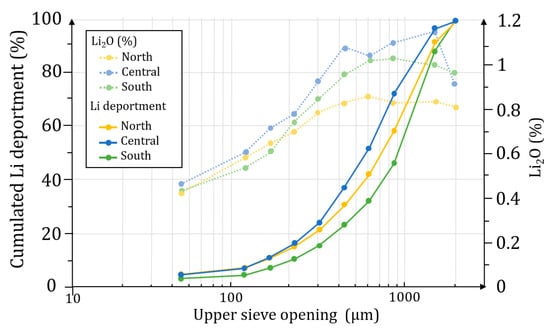 MLA revealed that the mean D80 (the size below which 80% of the total mica population belongs to) of the micas is 260 µm, but a variability was observed between the samples. The D80 of muscovite in the three upper composite samples (Figure 8) varied from 190 µm for north to 320 µm for central samples. In the case of the three lower samples, values were almost similar and found to be between 278 and 320 µm. In the upper section, the north area is the one displaying coarser micas, whereas it is the one with finer micas in the lower section. Moreover, the size of the micas decreased from upper to lower section in the northern area, whereas it increased in the center and did not change in the south.