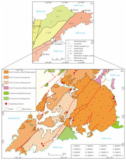 (a) Tectonic framework of the Jiaodong Peninsula. (b) Geological map and sampling location of the Qingdao granitoids.