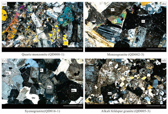 Photomicrographs showing minerals and textures of the granitoids in the Qingdao area. (a) Quartz monzonite (sample QD008-1). (b) Monzogranite (sample QD002-3). (c) Syenogranite (sample QD016-1). (d) Alkali feldspar granite (sample QD005-3). Abbreviations: Qtz-quartz; Kfs—K-feldspar; Pl—plagioclase; Ser—sericite; Bt—biotite.