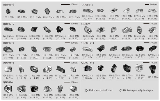 In this study, nine samples were used for zircon U–Pb dating and Lu–Hf isotopic analyses. The CL images of quartz monzonite and granite show that most zircons are euhedral to subhedral (Figure 3) with typical magmatic oscillatory zoning (Th/U > 0.1). These features collectively indicate that they are of magmatic origin. The quartz monzonite yielded a weighted mean 206Pb/238U age of 120.5 ± 1.2 Ma (sample QD008-1). The monzogranite yielded weighted mean 206Pb/238U ages of 119.2 ± 1.4 Ma (sample QD001-3) and 120.2 ± 1.3 Ma (sample QD002-2), respectively. The syenogranite yielded weighted mean 206Pb/238U ages of 117.4 ± 1.4 (sample QD0012-1) and 119.4 ± 1.3 (sample QD0016-1), respectively. The alkali feldspar granite yielded weighted mean 206Pb/238U ages of 118.6 ± 1.4 (sample QD003-1), 113.1 ± 1.6Ma (sample QD005-1), 117.0 ± 1.1 Ma (sample QD009-1), and 117.7 ± 1.2 Ma (sample QD0015-1), respectively. These results indicate that the crystallization age of the granitoids from the Qingdao area was in the Early Cretaceous (Table S1, Figure 4).