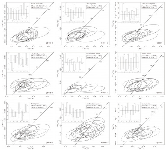Concordia diagram of zircon U–Pb dating results for the Qingdao granitoids. The ages in the diagram refer to the weighted mean 206Pb/238U ages (Ma).