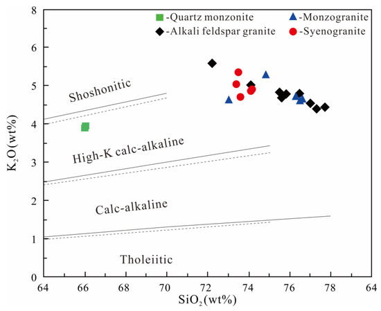 K2O vs. SiO2 diagrams for the Qingdao granitoids (modified after [20]).