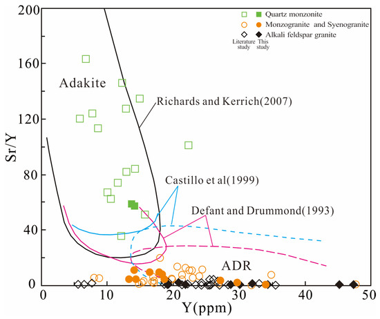 Sr/Y vs. Y diagram for the Qingdao granitoids. The literature data sources are from [11,15,17]. The solid line indicates the Adakite range, and the dotted line indicates the ADR range. The black lines are from [35]. The blue lines are from [34], and the orange lines are from [32].