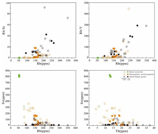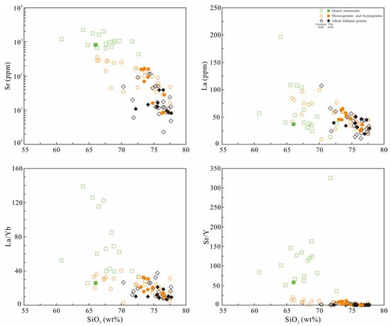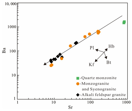 The depletion in Ba, Sr, P, Ti, Nb, and Ta of monzogranite and syenogranite indicated that the rocks experienced a high crystallization differentiation after partial melting. The negative anomalies of Sr and Ba are mainly caused by the crystallization differentiation of alkali feldspar. As shown in the Sr vs. Ba plot (Figure 13), alkali feldspar is a major fractionation phase, which can also interpret the Ba depletion, while the low Sr/Y ratios (0.61–11.27) and significant negative Eu anomalies are considered to be connected with the fractionation of plagioclase [52].