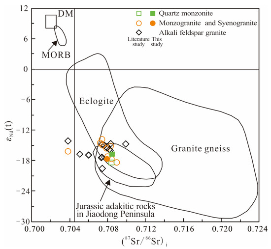 (87Sr/86Sr)I vs. εNd(t) for the Qingdao granitoids (modified after [30]). The ages for quartz monzogranite and monzogranite are 120.5 Ma and 119.4 Ma, respectively, which are used to calculate the (87Sr/86Sr)I and εNd(t). The literature data sources are from [11,15,17].