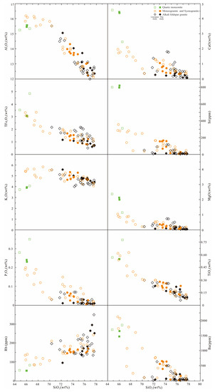 Plots of major and trace elements vs. SiO2 for the Qingdao granitoids. The literature data sources are from [11,15,17].