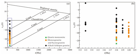 The zircon εHf(t) values for alkali feldspar granite are between −0.68 and −25.08, with the corresponding two-stage model ages ranging from 1213 to 2437 Ma. The εHf(t) values of the other granites are relatively low, and the two-stage model ages range from 2009 to 2755 Ma. The quartz monzonite samples show εHf(t) values ranging from −22.82 to −27.01, and the two-stage model age ranging from 2614 to 2876 Ma (Table S2).