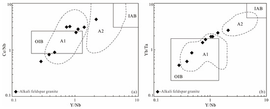 (a) Yb/Ta vs. Y/Nb and (b) Y/Nb vs. Ce/Nb diagrams for A-type granite (modified after [57]. OIB = ocean island basalt; IAB = island arc basalt).