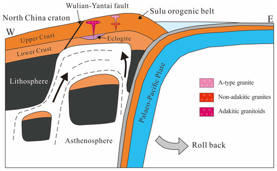 There were various tectonic causes that lead to lithospheric thinning in the NCC, including (1) the collision of the NCC and SCB [63,64], (2) a mantle superplume [67,68,69], and (3) the subduction of the Paleo-Pacific plate [45,70,71,72]. Some scholars believed that the collision of the NCC and SCB in the Triassic resulted in the thickening of the crust and the formation of a large volume of eclogites, which caused the delamination of the lithosphere. However, it is difficult to explain why the thickening of the crust in the Triassic did not cause delamination until 100 Ma [73]. Furthermore, the collision occurred in the west of the NCC, but the thinning mainly occurred in the east. Moreover, the orogenic belts formed by the collision of the NCC and SCB were distributed in the E–W direction, while the lithospheric thinning areas were distributed in the N–NE direction, which is not consistent with the distribution direction of the orogenic belts. Therefore, the collision of the NCC and SCB was only the tectonic basis of lithospheric thinning rather than the triggering factor [74]. Other scholars believed that the mantle upwelling affected the evolution of eastern China and led to the destruction of the NCC. However, there is still a lack of evidence for the existence of mantle superplume beneath the NCC during the Mesozoic. The eastern China continent shows a trend of being thick in the west and thin in the east at present, which is consistent with the subduction direction of the Paleo-Pacific plate in the Mesozoic. Geophysical data show that a high velocity anomaly appears in the eastern China continent within the depth range 930–1120 km, which may be related to the subduction of the Paleo-Pacific plate [75,76]. The subduction of the Paleo-Pacific plate was the most likely trigger for a lithospheric extensional environment in the eastern China during the Cretaceous due to the rollback process of the Paleo-Pacific slab [73,76,77]. It has been proposed that subduction of the Paleo-Pacific plate beneath the Eurasian plate was initiated at ca. 180–170 Ma [78,79]. The subduction angle changed from shallow to deep during the Late Jurassic, and slab rollback of which the rate reached the maximum in the Early Cretaceous at ca. 130–120 Ma [80]. Once the Paleo-Pacific plate is decoupled from the mantle wedge, the slab–mantle interface is heated by lateral incursion of the asthenospheric mantle to allow the dehydration melting of rocks in the metasomatized mantle wedge base. The partial melting of the mantle resulted in magma underplating, which provided the heat source. The continuous underplating caused the almost simultaneous partial melting of lower and middle crusts to form quartz monzonite and granite, respectively. The density of UHP eclogite partial melting residue is much higher than that of normal eclogite. The gravity of the high-density residue tended to be unstable, which was more conducive to the delamination and uplift of the orogenic belt, resulting in a large-scale crustal thinning in the eastern NCC and Sulu belt during the Early Cretaceous (Figure 17).