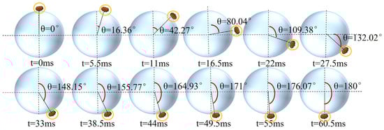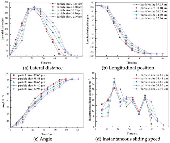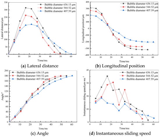- At a fixed bubble diameter of 544.52 μm, as the floc diameter increases, the time it takes for the floc to slide to the bottom of the bubble and stabilize decreases, and the instantaneous dynamic velocity changes more gradually, which is more conducive to the floc adhering to the bubble surface. The floc’s diameter reached 49.5 ms, and its highest instantaneous velocity was 28.67 μm·ms−1.