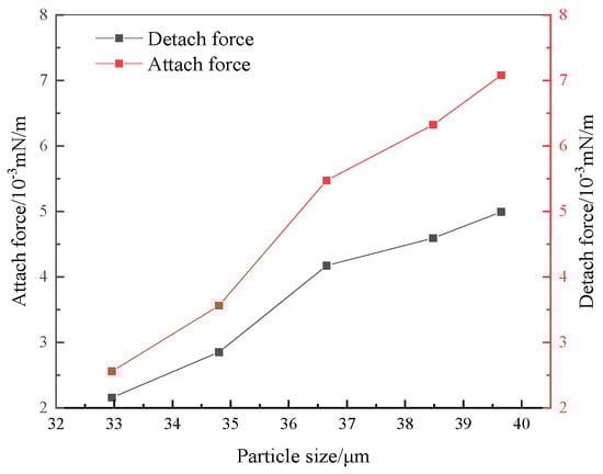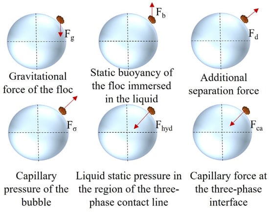 - After looking into the process of flocs on bubble surfaces, it was discovered that floc particle size RP and bubble width RB are the two key variables influencing the force of particles on bubble surfaces. The desorption force on the flocs is reduced and the Bond constant Bo′ is increased with increasing floc particle size. Conversely, the adhesion force on the flocs increases and the desorption force increases with growing floc particle size.