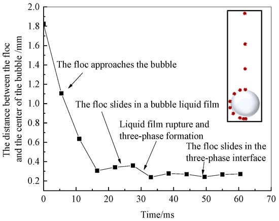 - The time taken for the floc to adhere to the bottom of the bubble is the shortest and the fluctuation range of the instantaneous sliding velocity of the floc is the smallest with a fixed floc size of 39.65 μm and bubble diameter of 544.52 μm, which make it more likely for the floc to adhere to the bubble surface after the collision.