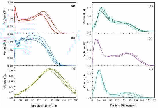 Grain size distribution curve of Jiuzhaigou: (a) special interlayer sediment of the Sparkling Lake dam body; (b) Sparkling Lake lacustrine sediments; (c) fluvial sediments in downstream Panda Lake; (d) trestle way-deposited particulate matter; (e) urban dust; (f) Ganzi loess.