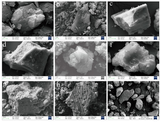 Morphology of Jiuzhaigou particulate matter under scanning electron microscopy: (a,b) special interlayer sediment of the Sparkling Lake dam body; (c,d) trestle way-deposited particulate matter; (e,f) Sparkling Lake lacustrine sediments; (g,h) fluvial sediments in downstream Panda Lake; (i) Ganzi loess.
