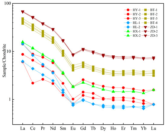 Distribution of rare earth elements in Jiuzhaigou by particulate matter. HY = collapsed limestone from mountains on both sides of Panda Lake; HL = fluvial sediments in downstream Panda Lake; HX = Sparkling Lake lacustrine sediments; BT = special interlayer sediment of the Sparkling Lake dam body; ZD = trestle way-deposited particulate matter.