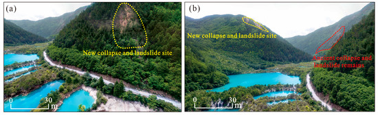 Evidence of the collapse of Sparkling Lake: (a) evidence of new collapse and landslide of the mountain on the right side of Sparking Lake; (b) evidence of mountain collapses and landslides on both sides of the upstream of Sparking Lake.