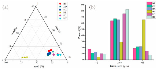 Grain size characteristics of Jiuzhaigou: (a) sediment grain size triangle illustration; (b) histogram of the percentage of each grain level. BT = special interlayer sediment of the Sparkling Lake dam body; ZD = trestle way deposited particulate matter; HX = Sparkling Lake lacustrine sediments; HL = fluvial sediments in downstream Panda Lake; FC = urban dust; HT = Ganzi loess.
