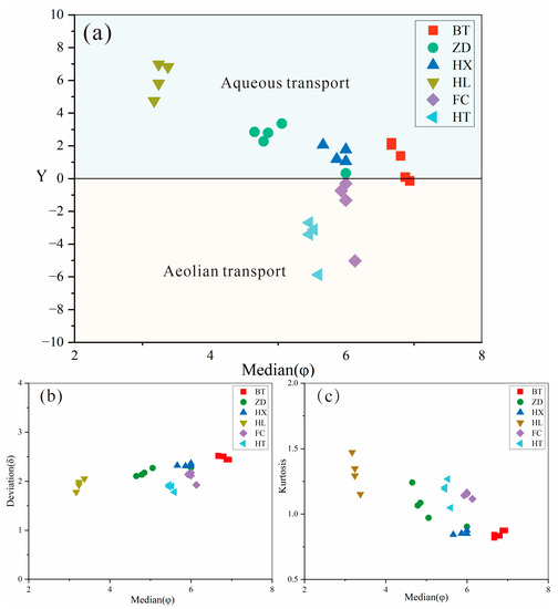 Grain size discriminant function diagram: (a) discriminant diagram for different deposition environments of particulate matter; (b) median–standard deviation scatter diagram; (c) median–kurtosis scatter diagram. BT = special interlayer sediment of the Sparkling Lake dam body; ZD = trestle way-deposited particulate matter; HX = Sparkling Lake lacustrine sediments; HL = fluvial sediments in downstream Panda Lake; FC = urban dust; HT = Ganzi loess.