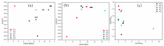 Scatter diagram of the characteristic parameters of rare earth elements: (a) Jiuzhaigou particulate matter Eu/Eu*-LREE/HREE scatter diagram; (b) Jiuzhaigou particulate matter Ce/Ce*-LREE/HREE scatter diagram; (c) Jiuzhaigou particulate matter LaN/SmN–GdN/YbN scatter diagram. HY = collapsed limestone from mountains on both sides of the Panda Lake; HX = Sparkling Lake lacustrine sediments; HL = fluvial sediments in downstream Panda Lake; BT = special interlayer sediment of the Sparkling Lake dam body; ZD = trestle way-deposited particulate matter.