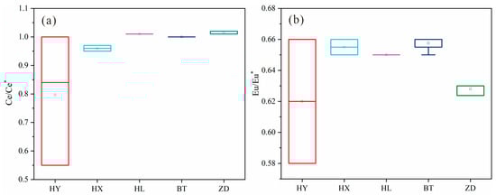Eu/Eu* and Ce/Ce* ratios of particulate matter in Jiuzhaigou. (a) Ce/Ce* ratio of different samples in Jiuzhaigou; (b) Eu/Eu* ratio of different samples in Jiuzhaigou. HY = collapsed limestone from mountains on both sides of the Panda Lake; HX = Sparkling Lake lacustrine sediments; HL = fluvial sediments in the downstream Panda Lake; BT = special interlayer sediment of the Sparkling Lake dam body; ZD = trestle way-deposited particulate matter.