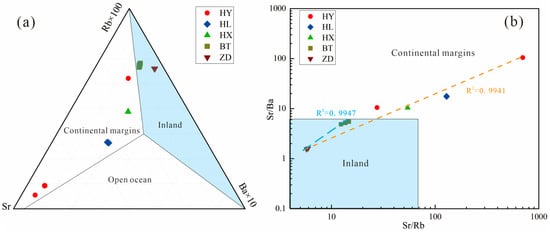 Rb, Sr, and Ba indicate the stability of particulate matter sources in Jiuzhaigou, bottom diagram reference from [68]. (a) Rb–Sr–Ba triangle diagram indicative of continental margin marine sedimentary features of limestones. (b) Sr/Ba–Sr/Rb diagram indicates source stability of particulate matter in Jiuzhaigou. HY = collapsed limestone from mountains on both sides of the Panda Lake; HX = Sparkling Lake lacustrine sediments; HL = fluvial sediments in the downstream Panda Lake; BT = special interlayer sediment of the Sparkling Lake dam body; ZD = trestle way-deposited particulate matter.