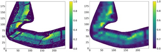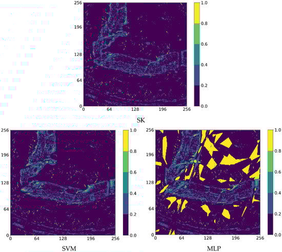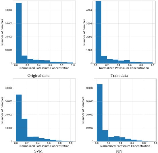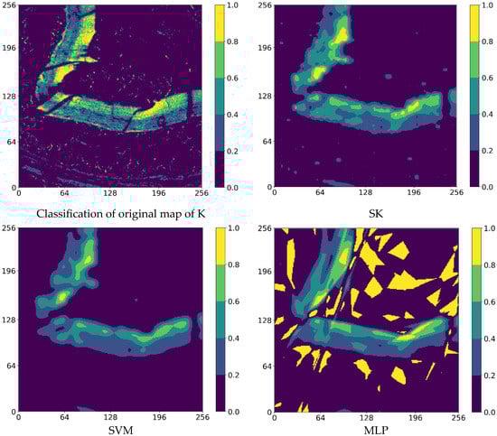 The results shown are estimated or predicted maps of K (potassium) using Support Vector Regression (SVR) (Radial Basis Function), Multi-Layer Perceptron (MLP), Nearest Neighbourhood (NN), Convolutional Neural Network (CNN), and Simple Kriging (SK). It should be noted that the data were normalized (0,1) and fed into the ML techniques (SVR and MLP) as it is an important step in machine learning [68]. In the cases of Simple Kriging, Nearest Neighbourhood, and CNN, the estimated variables and images were normalized after the results were obtained in order to compare the techniques under the same conditions. The sizes of all predicted maps are 256 × 256 pixels.