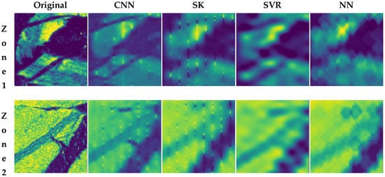 Figure 18 illustrates the predicted map obtained using all techniques mentioned above. As it can be inspected visually, the MLP technique produced the worst result in terms of following the geological features (shape and structure). In the cases of SVR, NN, and SK, the results show a smoothing effect that took place because of estimates based on the average weighted formula of Kriging [74]. The main reasons why MLP results in a poor reinstitution of the 2D maps can be due to a lack of consideration for the spatial structure [75] and reliance on manual feature engineering [76]. Moreover, fully connected architectures, like MLPs, have a greater risk of overfitting than the CNN architecture [77].