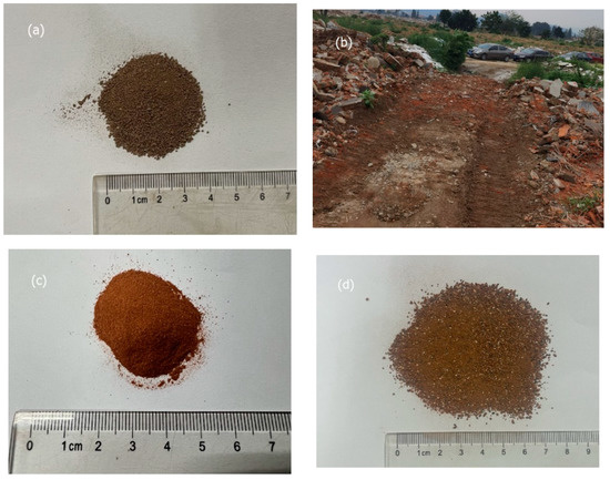 (a) Tailings sample; (b) Sampling site; (c) Brick powder sample; (d) Brick aggregate sample.