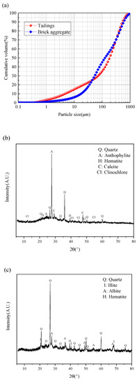 Laser particle size analysis of the tailings and brick aggregate was carried out using a Malvern 2000 laser particle size analyser, and the particle size distributions determined are shown in Figure 2a. The cumulative particle size distribution of the tailings was analysed as d10 = 4.703 μm, d30 = 70.963 μm, d50 = 183.865 μm, d60 = 244.016 μm, coefficient of nonuniformity Cu = 51.89 and coefficient of curvature Cc = 4.39. The cumulative particle size distribution of the brick aggregate was analysed as d10 = 18.666 μm, d30 = 56.368 μm, d50 = 142.804 μm, d60 = 224.403 μm, coefficient of nonuniformity Cu = 12.02 and coefficient of curvature Cc = 0.76. Both aggregates are poorly gradation and have a large number of coarse particles. The chemical composition of tailings, WCB, and cement was determined by X-ray fluorescence spectroscopy (XRF) using the Zenium equipment of PANalytical B.V. through powder compression. The results are shown in Table 1. The XRD patterns of tailings and WCB are shown in Figure 2b,c. It can be found that the main mineral components of the tailings are Quartz, Anthophylite, Hematite, Calcite and Clinochlore, while the main mineral components of WCB are Quartz, Illite, Albit and Hematite. The above three analysis methods were completed by the School of Materials, Qingdao University of Science and Technology staff.