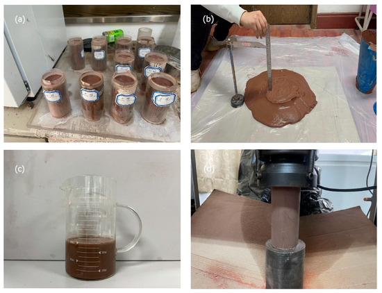 (a) Preparation of specimen; (b) Slump test; (c) Bleeding rate test; (d) Unconfined compression test.