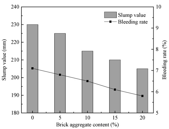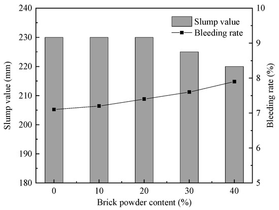 It can also be seen from Figure 5 that the bleeding rate of the CTB slurry decreases with an increase in the proportion of brick aggregate. This shows that adding brick aggregate makes the CTB slurry more water-retentive due to its water absorption when the cement content is the same. It can also be seen from Figure 4 that with the increase in the proportion of brick powder, the bleeding rate of CTB slurry increases. In addition, the lower the cement content in a CTB slurry, the more bleeding rate there is. This indicates that the high-water absorption of the brick powder replacing the cement does not achieve the water retention properties of the cement. This may be because the fine particles in the brick powder fill the tiny pores between the tailings and the cement, making the CTB denser and displacing the water in it [45].