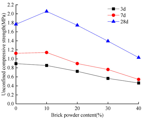 The unconfined compressive strength (UCS) of CTP at different curing ages is shown in Figure 6. It can be seen that the more the brick powder content, the smaller the UCS at the curing age of 3 d. At the curing age of 7 d and 28 d, the UCS tends to increase and then decrease with the increase of brick powder content, and the highest value of UCS in both ages is CTP10, which is 1.14 MPa and 2.05 MPa, respectively. This indicates that the strength enhancement effect of brick powder for the curing age 3 d is slight, and its strength is mainly derived from the cement content and the hydration reaction of the cement, which is also insufficient, with fewer hydration products and lower strength. However, the hydration reaction gradually increases with the extension of the curing age, the Ca(OH)2 in the hydration products, and the potential activity of the brick powder is fully stimulated, in which the active SiO2 and Al2O3 will consume the Ca(OH)2 in the hydration products of the cement for a secondary hydration reaction, which has a significant enhancement effect on the strength at the curing age of 7 d and 28 d. It can also be found that at 7 d of curing age, the UCS of CTP10 is 1.6% higher than that of CTP0, at 28 d of curing age, the UCS of CTP10 is 16.24% higher than that of CTP0, and the UCS of CTP20 is only 0.11% lower than that of CTP0. This indicates that up to 10% brick powder can increase the UCS of the original CTB at longer curing ages, and up to 20% brick powder content of CTB can maintain the UCS of the original CTB. Kulekci et al. [46] also obtained similar results, but its CTB had a higher UCS enhancement effect. This is because the addition of brick powder weakens the negative impact of sulfate on strength.