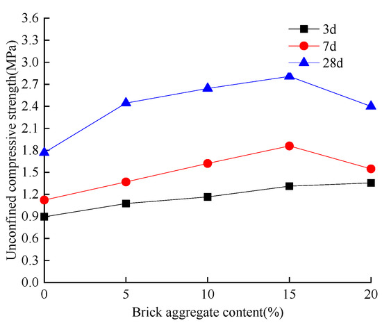 The unconfined compressive strength of CTA at different curing ages is shown in Figure 7. It can be seen that the higher the brick aggregate content at the curing age of 3 d, the larger the UCS. At the curing age of 7 d and 28 d, the UCS tends to increase and decrease as the brick aggregate content increases, with CTA15 having the highest UCS of 1.86 MPa and 2.81 MPa, respectively. This indicates that the higher the brick aggregate content at 3 d of the curing age, the finer particles in the brick aggregate where the pozzolanic reaction occurs and the more hydration products. However, at the curing age of 7 d and 28 d, CTA20, due to the high-water absorption of brick aggregate caused by the free water inside CTB, is adsorbed by a large amount of brick aggregate so that its internal free water content decreases with the increase of brick aggregate. The free water may have been consumed in large quantities at 3 d of the curing age, resulting in insufficient hydration reaction and slow reaction speed of subsequent cement, while the hydration reaction of cement and the pozzolanic reaction of fine particles in the brick aggregate are mutually promoting and mutually restricting processes. The inadequacy and slow hydration reaction rate will, in turn, slow down the rate of the pozzolanic reaction, resulting in a slowdown in the intensity growth rate in 7 d and 28 d of curing age. It is also possible that the water adsorbed by the brick aggregate will enter the microfractures and microporosity under pressure and accelerate the formation of cracks, leading to a reduction in structural strength due to the increased moisture content of CTA20. A higher UCS growth rate for CTB from 0% to 15% brick aggregate content can be found in CPA5 compared to CPA0 at the curing age of 28 d. This also reflects the faster rate of CPA5 hydration reactions and the pozzolanic reaction, which produces hydration products. In addition, the CTB with brick aggregate had the highest strength growth rate of 51.68% at 3 d of curing age, 65.54% at 7 d of curing age and 58.8% at 28 d of curing age compared to CPA0 alone. This contrasts CTB containing brick powder, where a suitable brick aggregate content can give CTB a strength advantage at curing ages 3 d and 7 d.