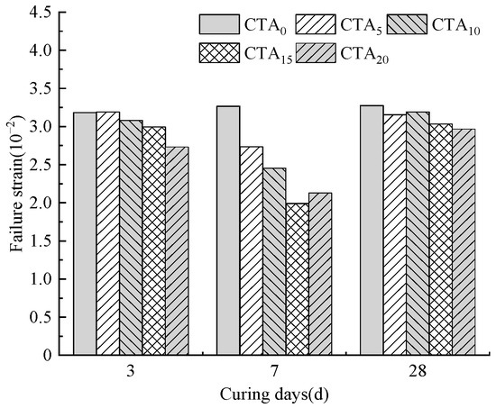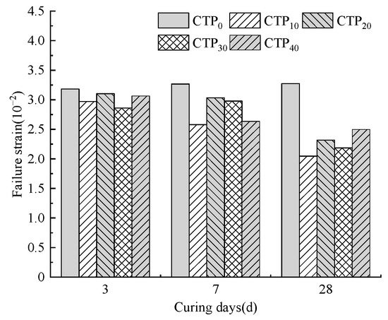 Failure strain refers to the peak stress axial strain, which fully reflects the deformation characteristics of the CTB specimen at ultimate strength conditions. Figure 8 shows the failure strain of CTP at different curing ages. It can be seen that the CTB specimens containing brick powder have a significant tendency to decrease in failure strain as the age of curing increases, but the CTP0 does not vary much from one curing age to another. The reduction in pore space within the CTB during the curing process can be inferred from the increase in the bleeding rate of the CTB containing brick powder. The production of AFt is affected by the number and size of the pores in the internal structure of the CTB. In addition, as the pozzolanic reaction, Ca(OH)2 is consumed in the specimen [47], and the amount of AFt produced is affected. The AFt crystals grow anisotropically and are needle-like so that at high strains, CTB specimens containing brick powder may not crack quickly enough to prevent rapid failure due to the reduced number of AFt crystals produced and the dispersion of internal stresses when compressed. In addition, another reason for the decrease in peak strain is that the interior of CTB containing brick powder is more compact, and the hydration products of the pozzolanic reaction fill the internal pores. Others have also obtained similar results [41,46].