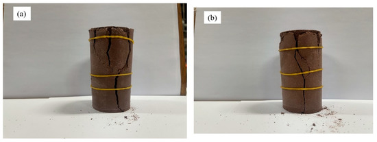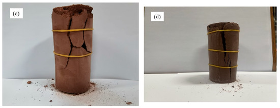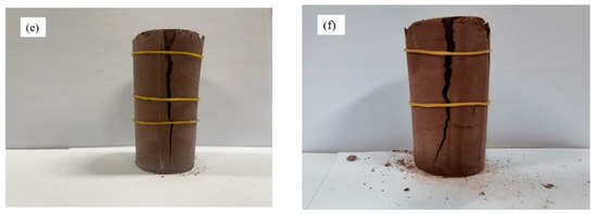 Figure 10 shows the failure mode of some CTB specimens in an unconfined compression test. It can be found that CTP0, with a curing age of 7 days, has S-type failure cracks and axial tensile cracks without showing obvious shear failure characteristics, as shown in Figure 10a. The CTP10 with a curing age of 7 days (Figure 10b) shows tensile failure. The CTA15, with a curing age of 7 days, exhibits a mixed failure of tension and shear, with dislocation and separation phenomena, as shown in Figure 10c. This is due to the development of internal cracks and imbalanced displacement recombination between particles in the CTB specimen under compression. From Figure 10d–f, it can be observed that CTP0, CTP10, and CTA15 with a curing age of 28 days, all exhibit tensile failure, but CTP10 exhibits more obvious brittle behavior.