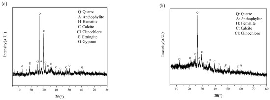 XRD pattern of CTB specimen with curing age of 28 d: (a) CTP0; (b) CTP20.