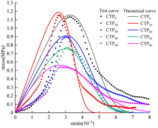 Peak stress, failure strain, elastic modulus, maximum stress at the initial compaction stage and yield point stress of CTB can be obtained by the stress-strain curve from the lab test results. The model curves and damage constitutive equations of CTP and CPA can be obtained by calculating the elastic modulus of the damaged specimen under each curve and introducing the correction factor . The three-stage theoretical curve and test curve of CTB are shown in Figure 14. It can be seen that the theoretical curve is in good agreement with the test curve, especially the initial compaction stage, the linear elastic stage, and the post-peak failure stage after 90% of the peak stress. This indicates that the correction factor has a good effect on correcting the post-peak curve. In addition, it can be found that some theoretical and test curves have certain differences in the plastic deformation stage and the initial stage of the post-peak failure stage because the post-peak curve drop rate is too high. It can also be seen from the experimental curve that the initial compaction stage of CTB is too long, which indicates that there are many pores and micro-cracks inside CTB, which will lead to certain randomness in the compression process.