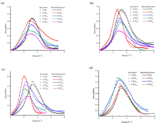 Formula (12) was fitted with the curve from the lab test results. It was found that the fitting results of CTB specimens containing brick powder and brick aggregate under different curing ages were relatively poor, and the differences were similar. Therefore, only CTB specimens containing brick powder at a curing age of 7 days were taken as examples, as shown in Figure 13.