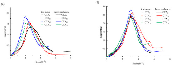 Comparison of theoretical curves and test curves: (a) CTP for curing age at 3 d; (b) CTP for curing age at 7 d; (c) CTP for curing age at 28 d; (d) CTA for curing age at 3 d; (e) CTA for curing age at 7 d; (f) CTA for curing age at 28 d.