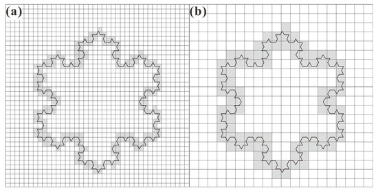 where ∝ represents proportionality, c is a constant, and D is the fractal dimension estimated by the box-counting method. The Koch curve, first introduced by Koch in 1904, is a prototypical fractal curve. It is divided into squares as shown in Figure 2. Using the BC method (Table 2), the fractal dimension can be calculated as D = 1.2. Objects with irregular and complex geometry generally exhibit a non-integer (fractal) dimension [80]. Essentially, this means that the intricacy of an object directly correlates with its fractal dimension. In simpler terms, the more intricate and complex an object appears to be, the higher its fractal dimension will be.