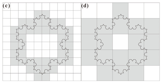 A sampling process of BC method applied to calculate the fractal dimension of Koch curve. (a) The cell size is 1; (b) the cell size is 2; (c) the cell size is 4; (d) the cell size is 8.
