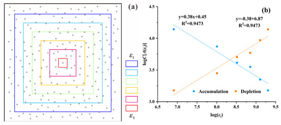 Without loss of generality, the modeling is carried out in two dimensions as an example. Assume that in the two-dimensional plane, the i-th box of the mineralizing element with edge length ε has measure μi(ε), and the measure μi(ε) is the total content of that element within the box. Thus, the total content of a local element can be represented by the measure on the i-th box of size. The measure of the grid in space with length ε is μi(ε). Let ε be the length of the i-th box containing a mineralizing element with measure μi(ε), which represents the total content of that element within the box. Therefore, the measure on each i-th box with size ε can represent the total content of a local element. The measure of the space grid with length ε is also μi(ε), and a power–law relation can be expressed as follows.