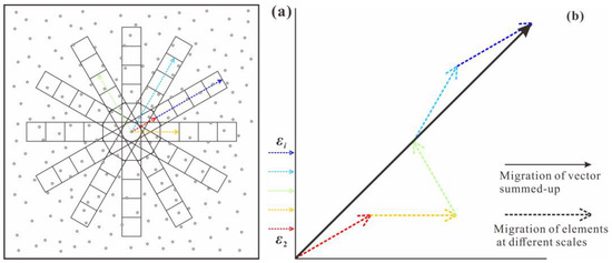 - Vectors with arrows are used to mark all azimuths of selected windows at each scale, which are then summed up to represent the anisotropic migration and/or distributions of ore elements;