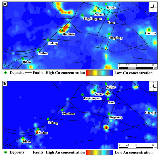 Geochemical distributions of ore elements interpolated by IDW: (a) Cu and (b) Au.