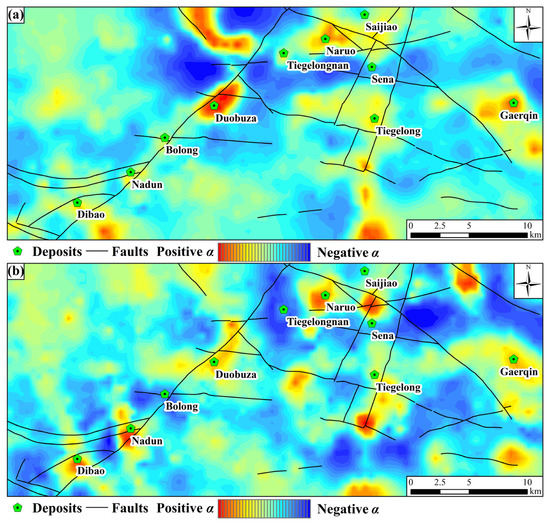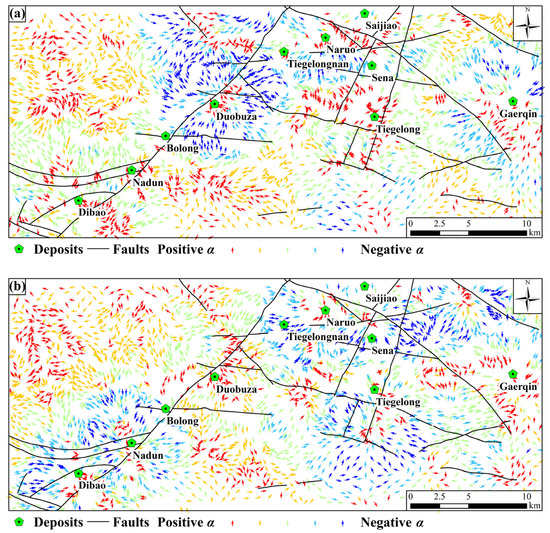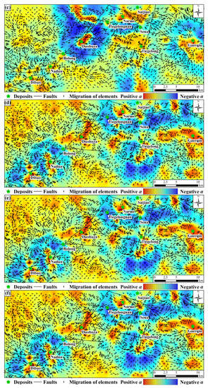 The anisotropic singularity not only provides stronger ideation but also enhances the overall quality of analysis. Each sampling location is assigned an anisotropic direction, which indicates the final migration direction of ore materials. This direction is determined by fitting the window’s direction selected at different scales using the vector summed-up method (Figure 4b), as previously mentioned. If the singularity index α is less than 1 (α < 1) at a given sample location, it indicates enrichment of ore elements in the local area, with changing behavior from high to low as one moves towards the sample location from outside (Figure 9). Conversely, if α is greater than 1 (α > 1), there is a loss of elements at that location, and the variation in ore element behavior changes from low to high as one moves away from the sample location. The novel approach emphasizes the impact of fracture tectonics and magmatic rocks on the geochemical behavior of ore elements by considering the anisotropic nature of mineralization. For the low-temperature copper element, both forward and backward arrows effectively demonstrate that mineralization is primarily controlled by NE trending faults. Additionally, enrichment patterns (indicated by red arrows) are located at fault intersections. The NW trending faults predominantly intersect the depletion patterns (indicated by blue arrows), indicating their post-mineralization origin and dominance in the fracturing and/or reconstruction of ore deposits within this region. That provides compelling evidence for the significance of the proposed anisotropic singularity estimation method in delineating mineralization-related geochemical fields and elucidating elemental transport pathways. The locations with Cu-Au mineralization potentials in the Duolong mineral district are delineated by enrichment patterns of ore elements, which spatially match discovered deposits and outcropped porphyries at the intersection of NE and NW trending faults. This coincidence supports previous geological knowledge that mineralization in this district is highly associated with a mesh-like fault system with a rhombus shape. It is also predicted that the southern and northwestern of the district may have similar potentials for mineralization. Most of discovered mineral deposits including Duobuza, Nadun, Dibao, and Garqin are located in areas with positive singularity values while the Tiegelongnan and Sena are situated in areas of negative ones. The presence of volcanic strata, specifically the Meiriqiecuo formation, not only aids in the preservation of the Tiegelongnan deposit but also obstructs positive geochemical anomalies [71]. Due to the small scale and deep burial of ore bodies in the Sena deposit [67], the current analysis of geochemical data collected from secondary media may not effectively identify its affected areas. Therefore, while the current algorithm is effective in narrowing down the target area, limitations in the analyzed data (i.e., geo-information carrier) are also evident.