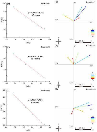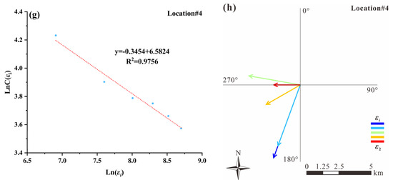 Log–log graphs and multi-scale elliptical windows for estimating singularity indices of Cu at the four locations marked in Figure 8a: (a,b) Location#1; (c,d) Location#2; (e,f) Location#3; and (g,h) Location#4.