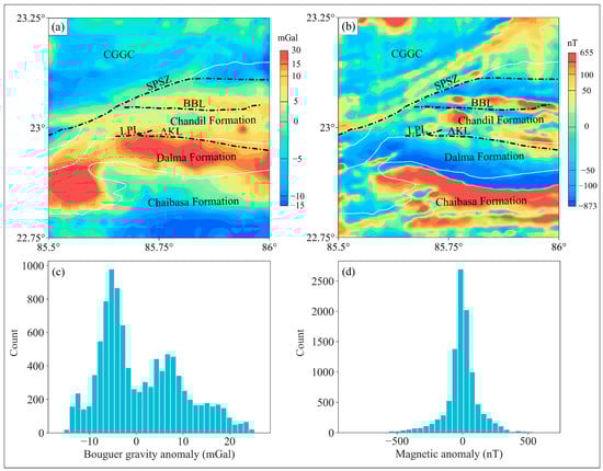 (a) Bouguer gravity and (b) magnetic anomalies maps were generated with a regular grid interval spacing of 500 m. Corresponding histogram plots are shown in (c) and (d), respectively. In Figure 3a,b, black dashed-dotted lines represent lineaments/shear zones, while solid white lines indicate the major geological boundaries of the study area. AKL refers to the Antabera–Kuda lineament, BBL represents the Babaikundi–Birgaon lineament, CGGG stands for Chotanagpur Granite Gneiss Complex, LPL denotes the Lungtu–Parasi lineament, and SPSZ represents the South Purulia Shear Zone.