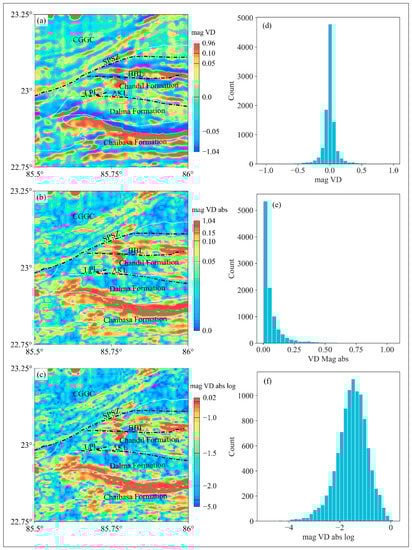 Stepwise feature engineering procedure for the magnetic anomaly data. (a) Vertical derivative of the magnetic anomaly. (b) Absolute values of the vertical derivative of the magnetic anomaly. (c) Logarithm transformation (log10) of the absolute vertical derivative of the magnetic anomaly. Plots (d–f) illustrate the corresponding feature engineered magnetic anomaly data distributions for (a–c), respectively. The other details displayed on the maps (Figure 4a–c) are identical to Figure 3.