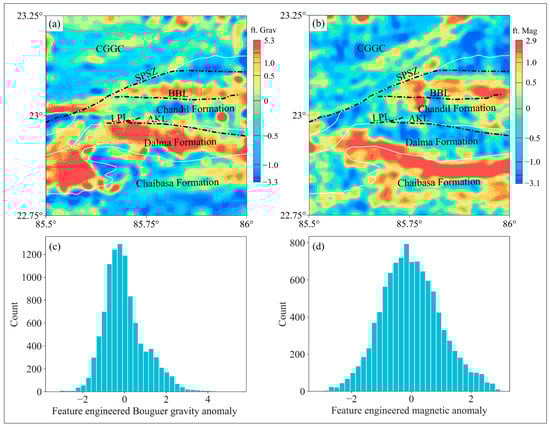 Similarly, the magnetic observations were corrected for the Earth’s main magnetic field using a suitable International Geomagnetic Reference Field (IGRF) model to obtain the magnetic anomaly. Additionally, the regional-residual separation of Bouguer gravity and magnetic anomalies was carried out as they contain information from anomalous sources with different depths and different densities or magnetizations. For this purpose, upward continuation filtering was applied to the Bouguer gravity and magnetic anomalies to obtain the long wavelength signatures associated with deep-seated sources [56]. These long wavelength signatures were further subtracted from Bouguer gravity and magnetic anomalies to obtain the residual Bouguer gravity/magnetic anomalies. To utilize these datasets in our study, we generated residual Bouguer gravity (Figure 3a) and magnetic anomaly maps (Figure 3b) using a uniform grid spacing of 500 m, resulting in 10,201 samples. The corresponding data distributions are presented in Figure 3c,d, respectively.
