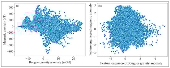 The 2D cross-plots of the Bouguer gravity and magnetic anomalies are shown before (a) and after (b) feature engineering.